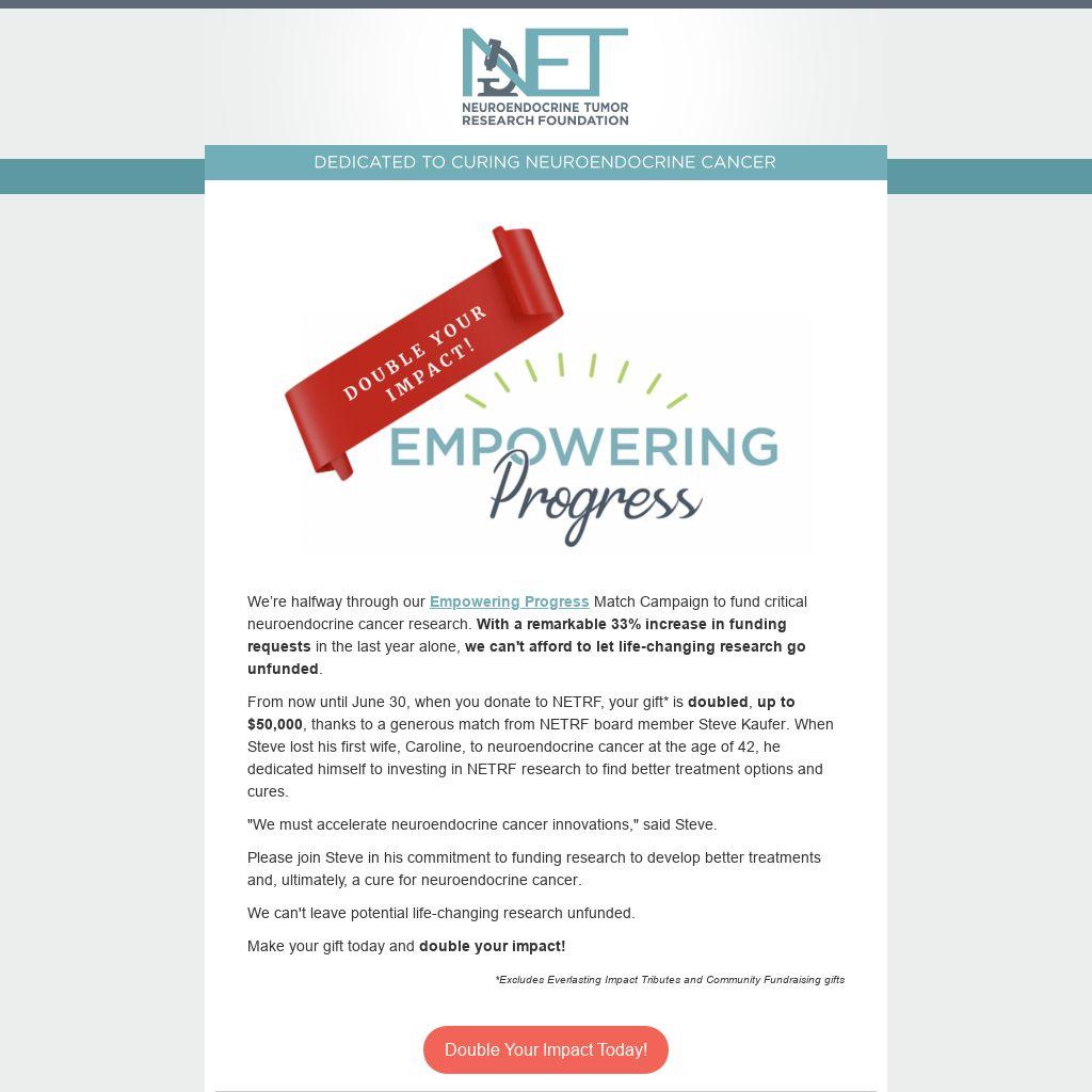 From now until June 30, when you donate to NETRF, your gift* is doubled, up to $50,000, thanks to a generous match from NETRF board member Steve Kaufer. When Steve lost his first wife, Caroline, to neuroendocrine cancer at the age of 42, he dedicated himself to investing in NETRF research to find better treatment options and cures.