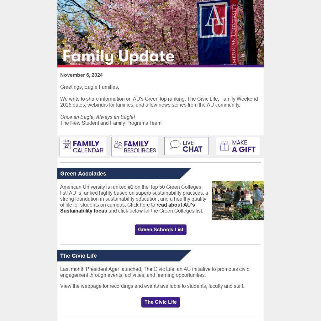 We write to share information on AU's Green top ranking, The Civic Life, Family Weekend 2025 dates, webinars for families, and a few news stories from the AU community.