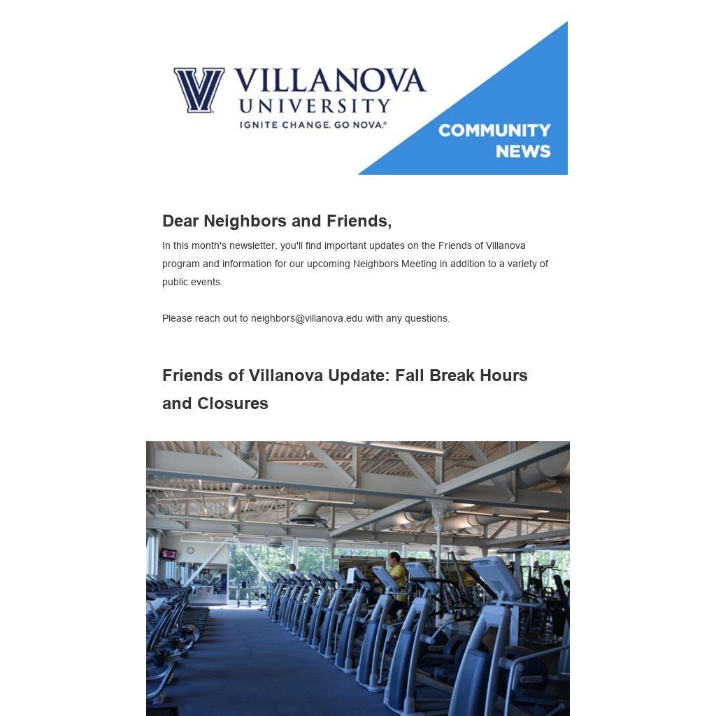 Dear Neighbors and Friends, In this month's newsletter, you'll find important updates on the Friends of Villanova program and information for our upcoming Neighbors Meeting in addition to a variety of public events.
