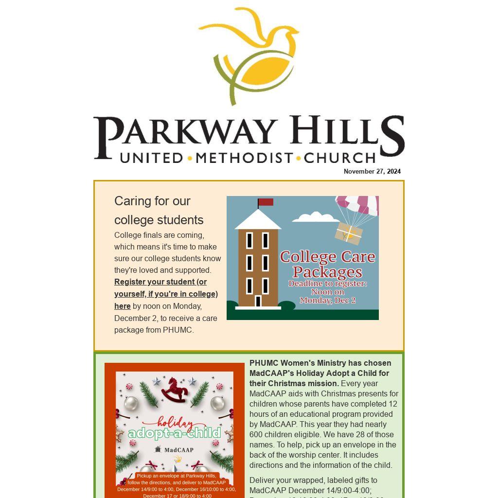 207 boxes of stuffing were delivered to MadCAAP to help fill their Thanksgiving Community Boxes. Parkway Hills committed to providing 500 boxes of stuffing, or the financial equivalent, to MadCAAP. November Communion Offering supports this effort, and at the end of the month, all November offerings will be sent to MadCAAP. So far, $1,349.00 has been collected.Thank you for your generosity in giving to PHUMC to fulfill our mission to be helpful in our community.