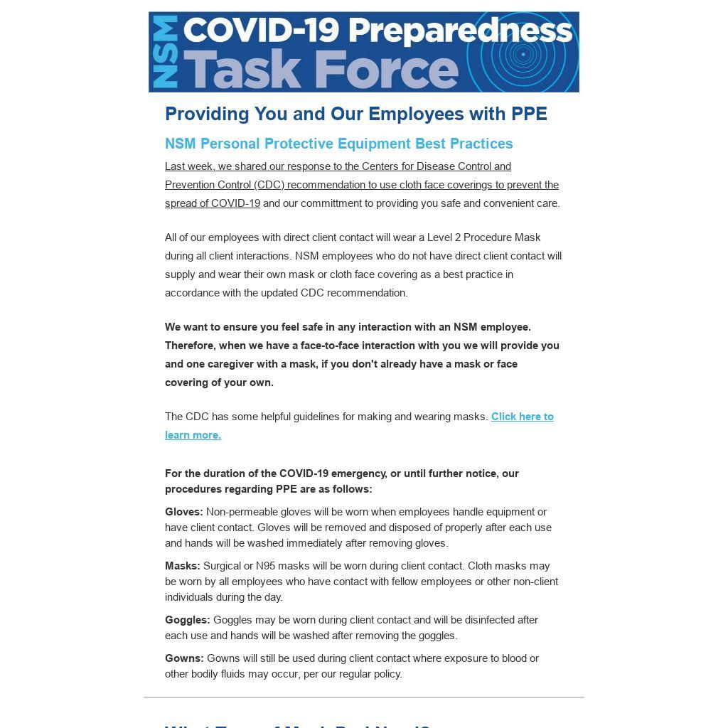 All of our employees with direct client contact will wear a Level 2 Procedure Mask during all client interactions. NSM employees who do not have direct client contact will supply and wear their own mask or cloth face covering as a best practice in accordance with the updated CDC recommendation.