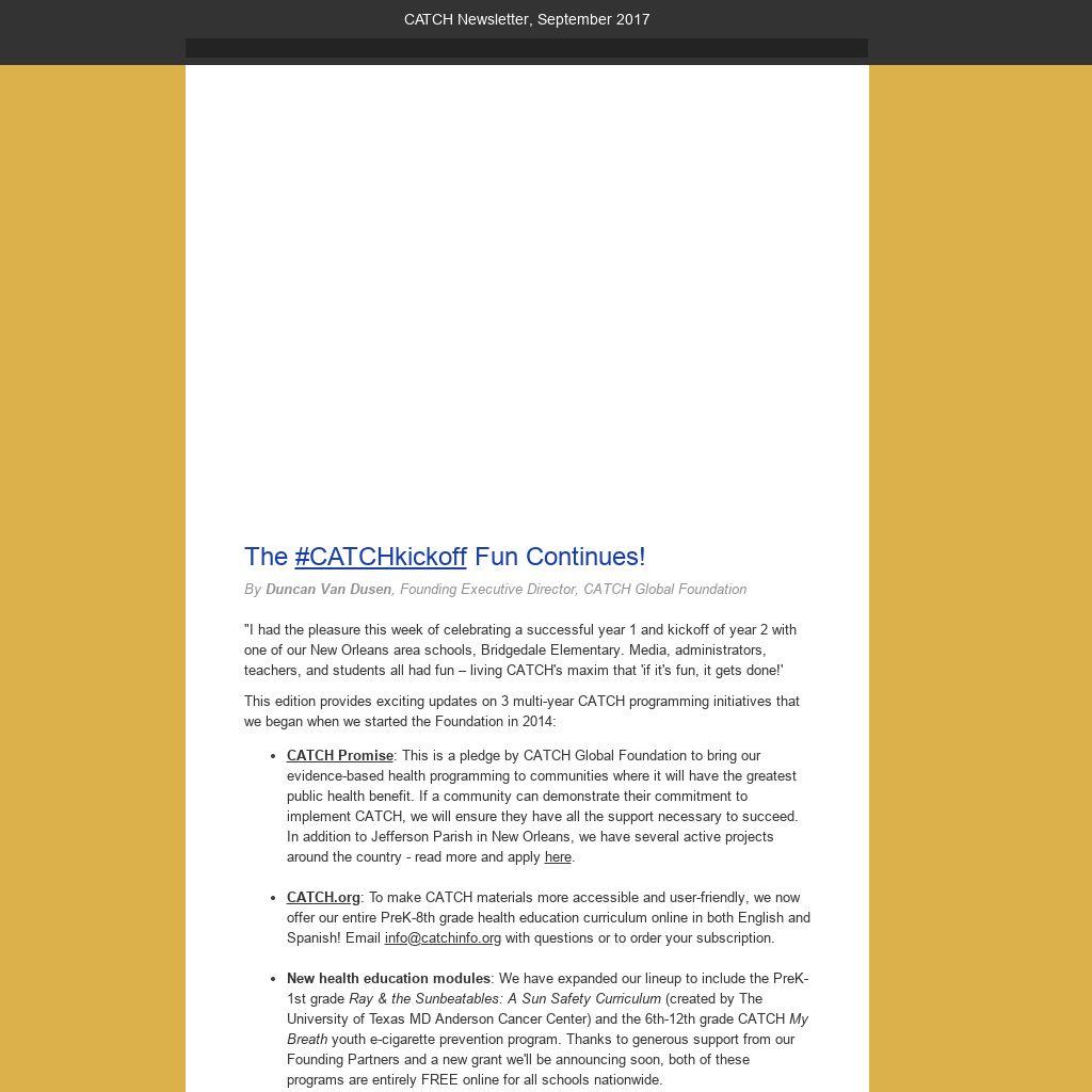 This edition provides exciting updates on 3 multi-year CATCH programming initiatives that we began when we started the Foundation in 2014: - CATCH Promise: This is a pledge by CATCH Global Foundation to bring our evidence-based health programming to communities where it will have the greatest public health benefit. If a community can demonstrate their commitment to implement CATCH, we will ensure they have all the support necessary to succeed. In addition to Jefferson Parish in New Orleans, we have several active projects around the country - read more and apply here.