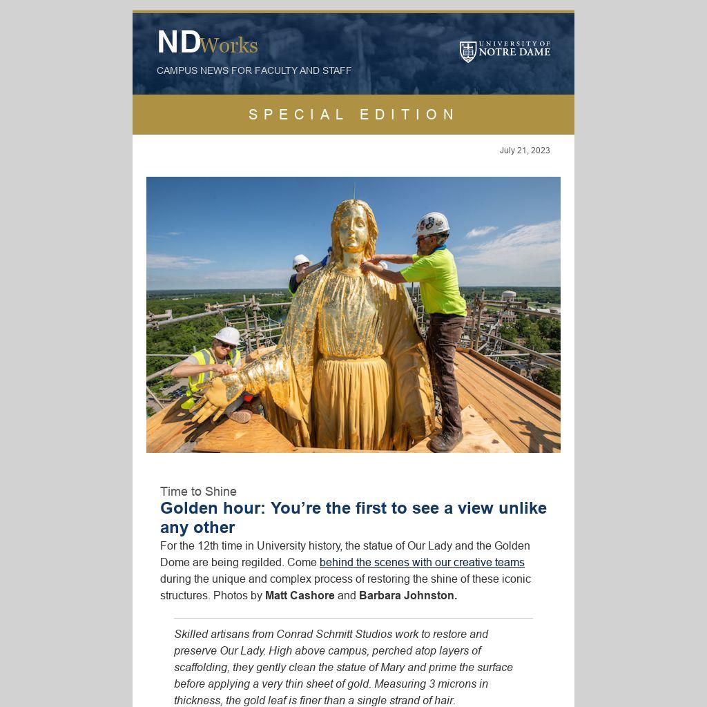 For the 12th time in University history, the statue of Our Lady and the Golden Dome are being regilded. Come behind the scenes with our creative teams during the unique and complex process of restoring the shine of these iconic structures. Photos by Matt Cashore and Barbara Johnston.