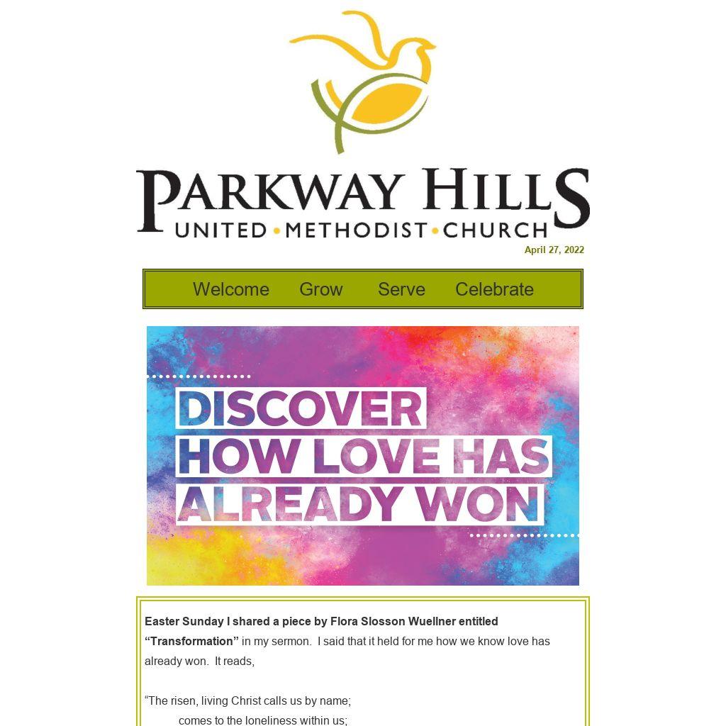 In worship, throughout the month of May, we will look at post-resurrection encounters found in scripture and use “Transformation” to reflect on how through Christ, with Christ, and in Christ, love has already won! I hope to see you in worship as we continue the Easter celebration.