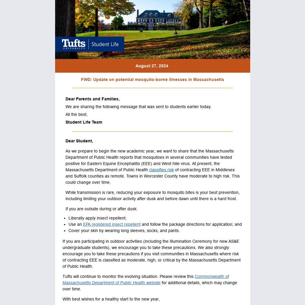Tufts will continue to monitor the evolving situation. Please review this Commonwealth of Massachusetts Department of Public Health website for additional details, which may change over time.
