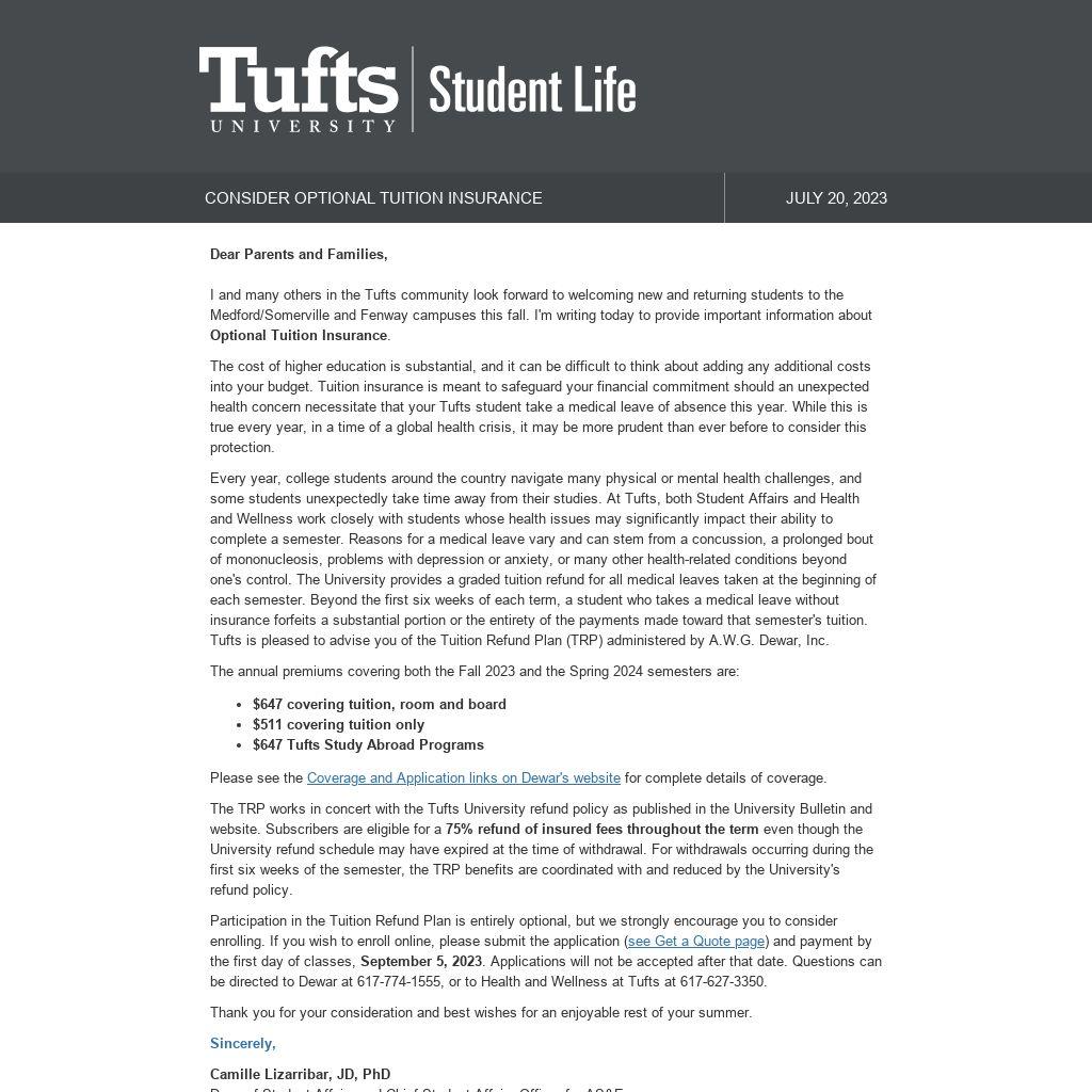 I and many others in the Tufts community look forward to welcoming new and returning students to the Medford/Somerville and Fenway campuses this fall. I'm writing today to provide important information about Optional Tuition Insurance.