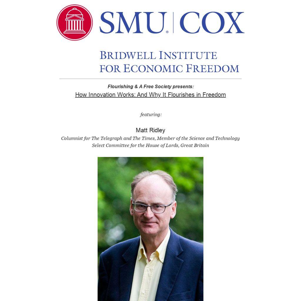 Join us for this in-person event as Matt Ridley discusses his book, How Innovation Works: And Why It Flourishes in Freedom. In his book, Dr. Ridley argues that we need to see innovation as an incremental, bottom-up, fortuitous process that happens as a direct result of the human habit of exchange, rather than an orderly, top-down process developing according to a plan. Innovation is crucially different from invention, because it is the turning of inventions into things of practical and affordable use to people.