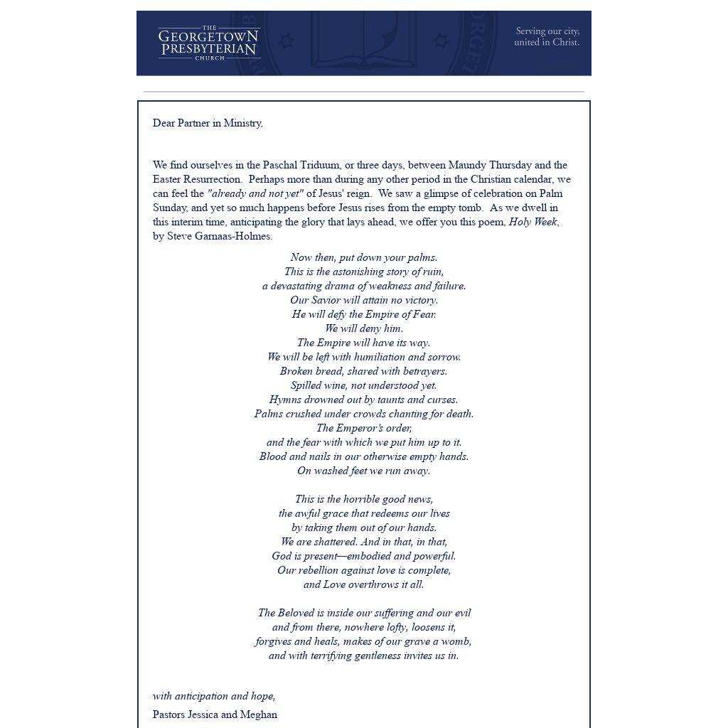 We find ourselves in the Paschal Triduum, or three days, between Maundy Thursday and the Easter Resurrection. Perhaps more than during any other period in the Christian calendar, we can feel the "already and not yet" of Jesus' reign. We saw a glimpse of celebration on Palm Sunday, and yet so much happens before Jesus rises from the empty tomb. As we dwell in this interim time, anticipating the glory that lays ahead, we offer you this poem, Holy Week, by Steve Garnaas-Holmes.
