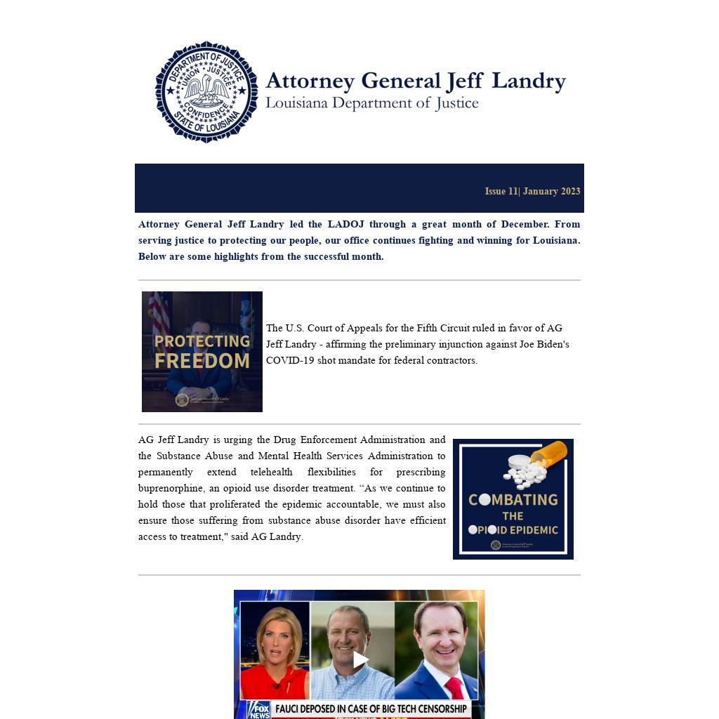 AG Jeff Landry is urging the Drug Enforcement Administration and the Substance Abuse and Mental Health Services Administration to permanently extend telehealth flexibilities for prescribing buprenorphine, an opioid use disorder treatment. “As we continue to hold those that proliferated the epidemic accountable, we must also ensure those suffering from substance abuse disorder have efficient access to treatment," said AG Landry.