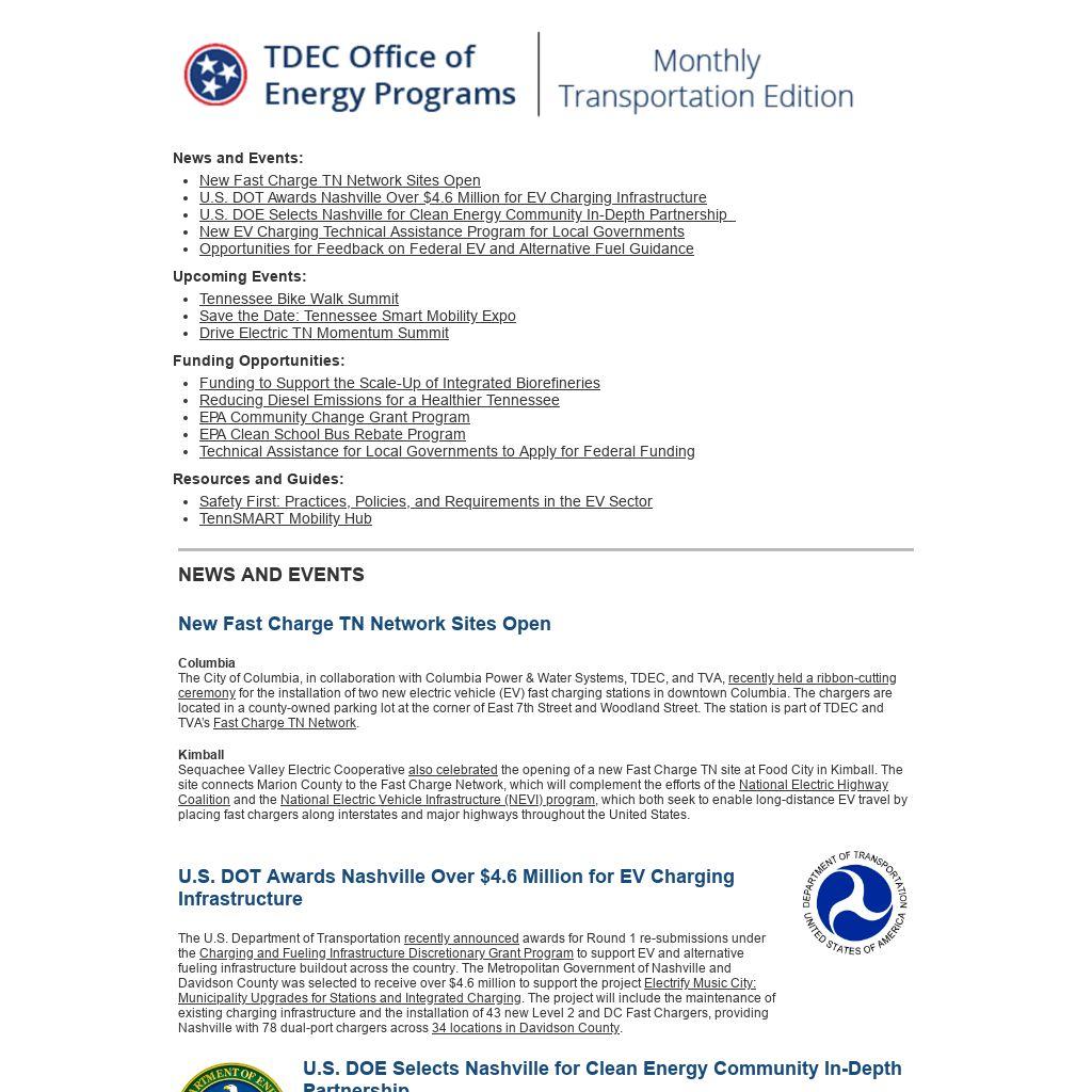 U.S. DOE recently announced three communities that will receive a combined $10 million in funding and technical assistance to research, model, validate, and deploy local clean energy strategies. Selected teams will work closely with experts from U.S. DOE national laboratories over two to three years through an in-depth partnership under the Clean Energy to Communities Program. Nashville Electric Service, the Metropolitan Government of Nashville and Davidson County, Middle-West Tennessee Clean Fuels, and the Urban League of Middle Tennessee will receive support to develop an integrated roadmap to achieve Nashville’s citywide goal to reduce carbon emissions 80% by 2050 while increasing resiliency and reliability for residents. TDEC OEP provided proposal support for the application.