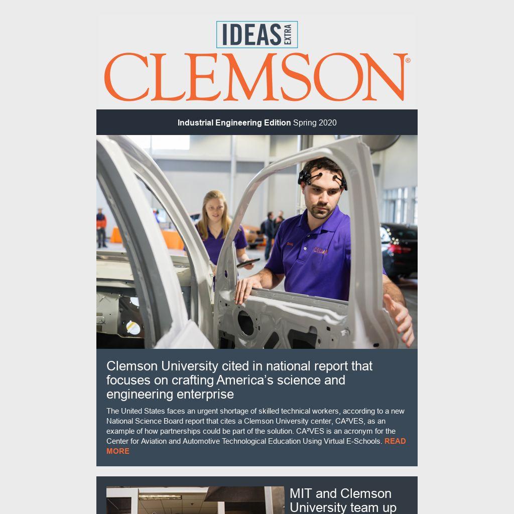 IDEAS Extra: Industrial Engineering Edition is published by the Clemson University Department of Industrial Engineering in the College of Engineering, Computing and Applied Sciences.