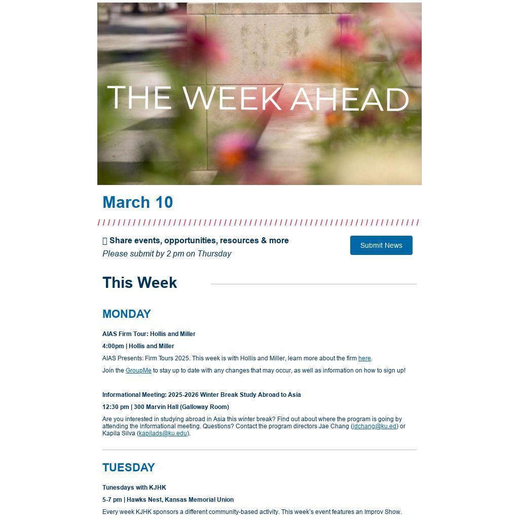 Drop-in advising is available between 12:30-4:00 every Monday and Thursday. Students are invited to meet with their advisor virtually via Zoom or in-person in Snow Hall 252 during those hours. More information on drop-ins can be found here: Drop-In Advising | Jayhawk Academic Advising