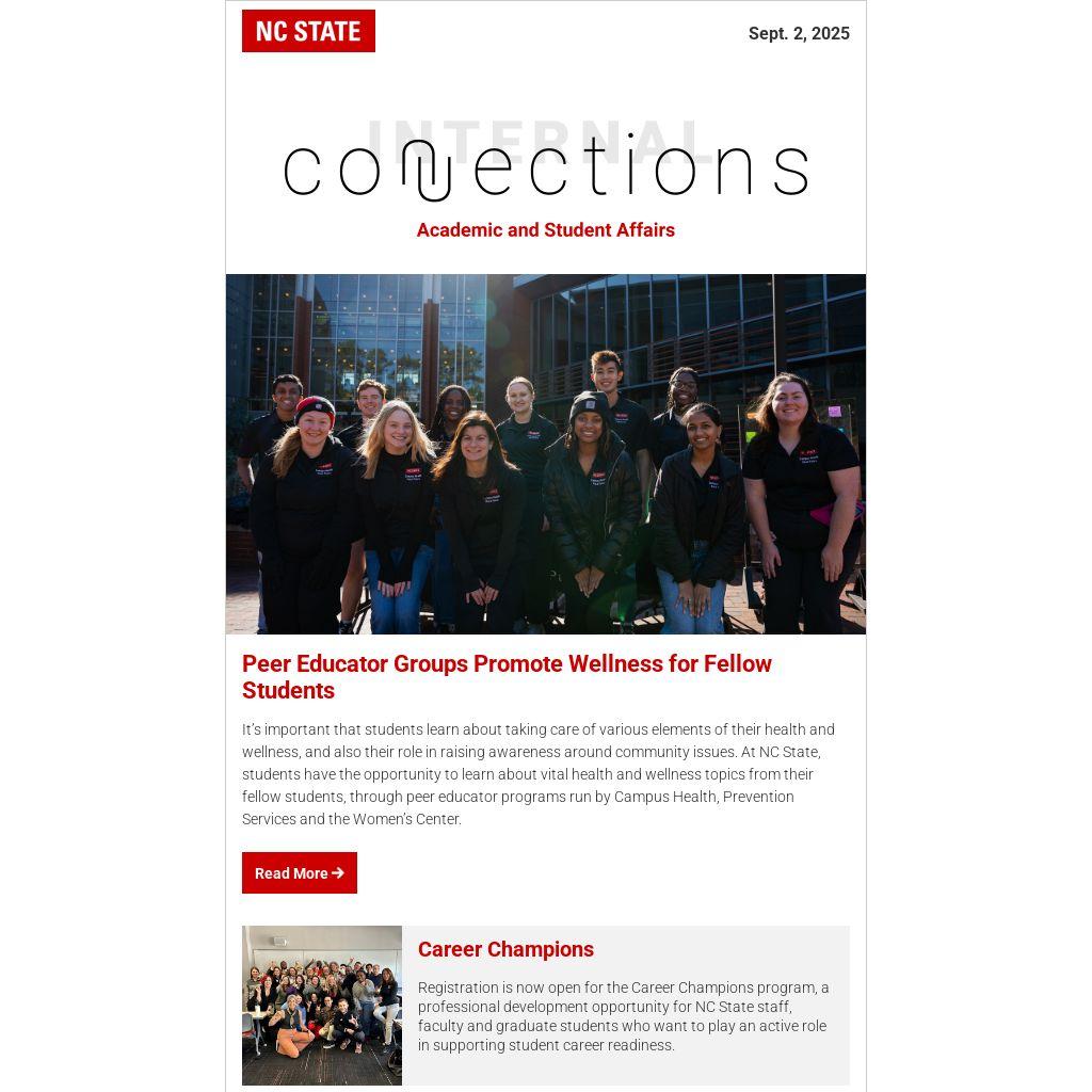 It’s important that students learn about taking care of various elements of their health and wellness, and also their role in raising awareness around community issues. At NC State, students have the opportunity to learn about vital health and wellness topics from their fellow students, through peer educator programs run by Campus Health, Prevention Services and the Women’s Center.