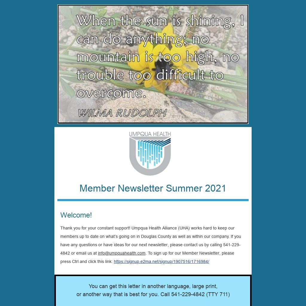 Thank you for your constant support! Umpqua Health Alliance (UHA) works hard to keep our members up to date on what’s going on in Douglas County as well as within our company. If you have any questions or have ideas for our next newsletter, please contact us by calling 541-229-4842 or email us at info@umpquahealth.com. To sign up for our Member Newsletter, please press Ctrl and click this link: https://signup.e2ma.net/signup/1907516/1716984/