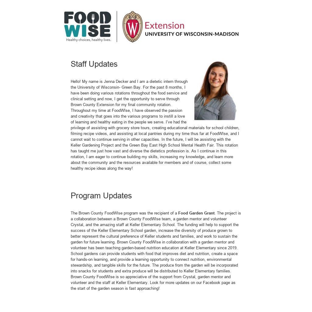 Hello! My name is Jenna Decker and I am a dietetic intern through the University of Wisconsin- Green Bay. For the past 8 months, I have been doing various rotations throughout the food service and clinical setting and now, I get the opportunity to serve through Brown County Extension for my final community rotation. Throughout my time at FoodWIse, I have observed the passion and creativity that goes into the various programs to instill a love of learning and healthy eating in the people we serve. I’ve had the privilege of assisting with grocery store tours, creating educational materials for school children, filming recipe videos, and assisting at local pantries during my time thus far at FoodWIse, and I cannot wait to continue serving in other capacities. In the future, I will be assisting with the Keller Gardening Project and the Green Bay East High School Mental Health Fair. This rotation has taught me just how vast and diverse the dietetics profession is. As I continue in this rotation, I am eager to continue building my skills, increasing my knowledge, and learn more about the community and the resources available for members and of course, collect some healthy recipe ideas along the way!
