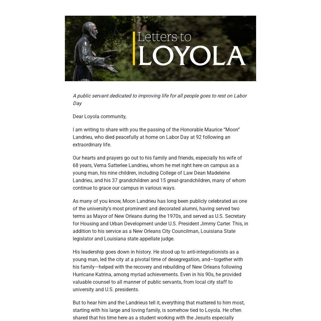 Our hearts and prayers go out to his family and friends, especially his wife of 68 years, Verna Satterlee Landrieu, whom he met right here on campus as a young man, his nine children, including College of Law Dean Madeleine Landrieu, and his 37 grandchildren and 15 great-grandchildren, many of whom continue to grace our campus in various ways.