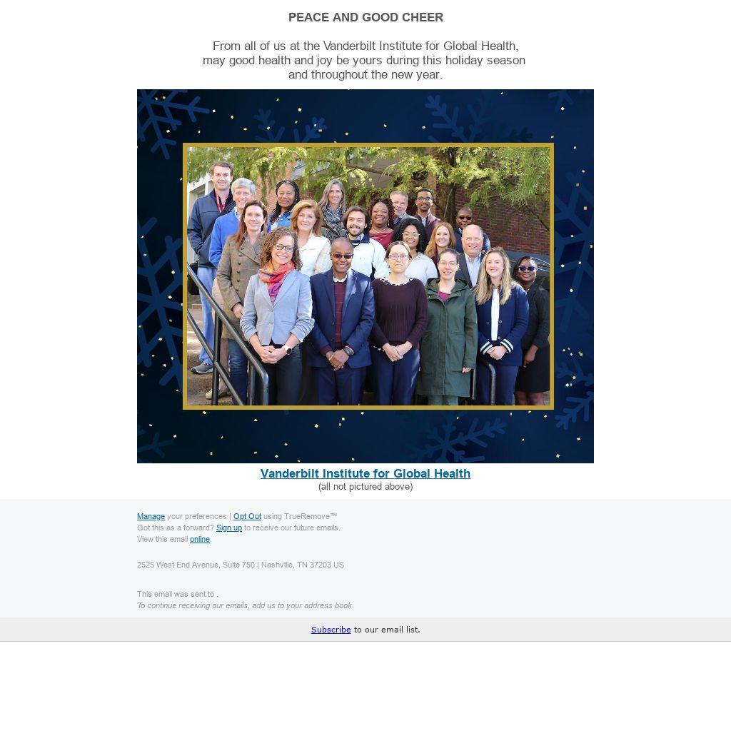 PEACE AND GOOD CHEERFrom all of us at the Vanderbilt Institute for Global Health, may good health and joy be yours during this holiday season and throughout the new year.