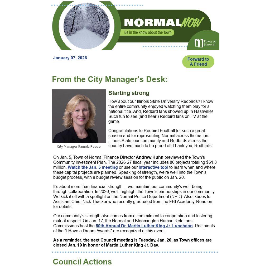On Jan. 5, Town of Normal Finance Director Andrew Huhn previewed the Town's Community Investment Plan. The 2026-27 fiscal year includes 80 projects totaling $61.3 million. Watch the Jan. 5 meeting or use our interactive tool to learn when and where these capital projects are planned. Speaking of strength, we're well into the Town's budget process, with a budget review session for the public on Jan. 20.