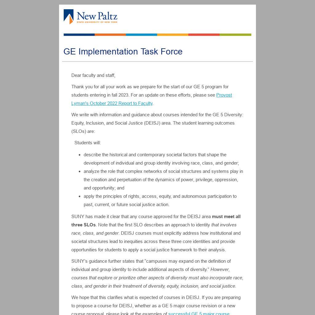 Thank you again for all your hard work on this project. Don’t forget that all previous Task Force messages, the GE 5 major course revision form along with successful examples of courses revised for GE 5, and an FAQ can all be found on the GE Board’s website, here: www.newpaltz.edu/ge.