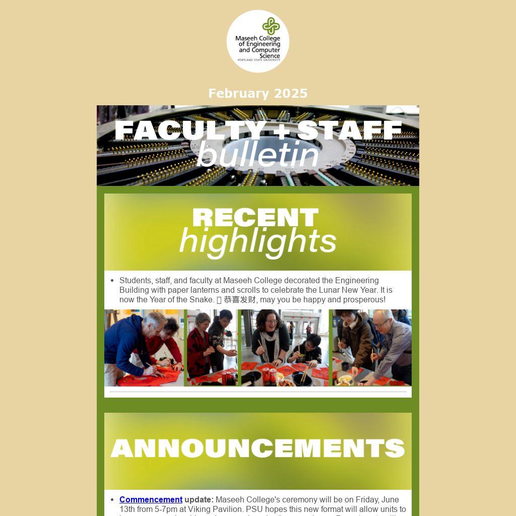 - The second-annual Maseeh College Prospective Transfer Student Day is happening on February 28th from 1-4pm. Community college students come to campus and hear from Maseeh faculty and staff and take tours with demos in labs, followed by a resource fair in the Atrium.