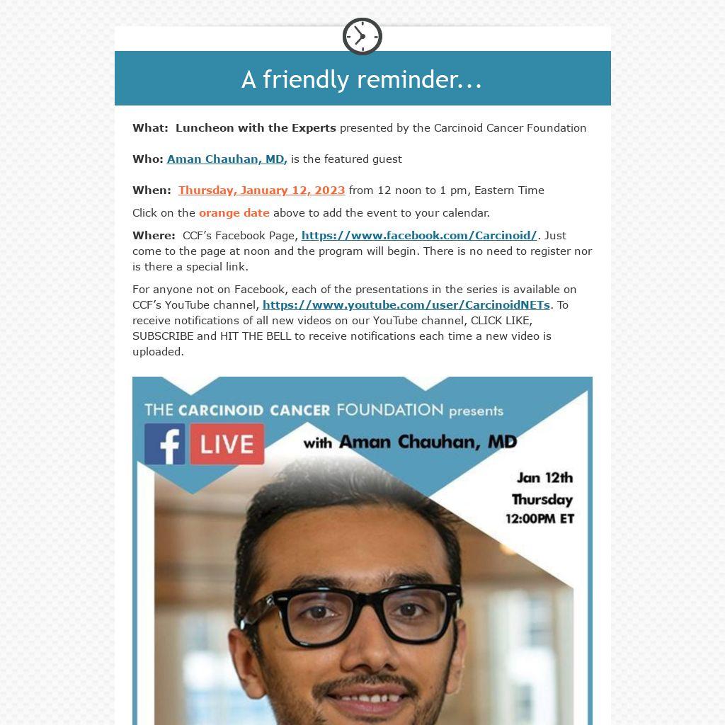 Where:  CCF’s Facebook Page, https://www.facebook.com/Carcinoid/. Just come to the page at noon and the program will begin. There is no need to register nor is there a special link.