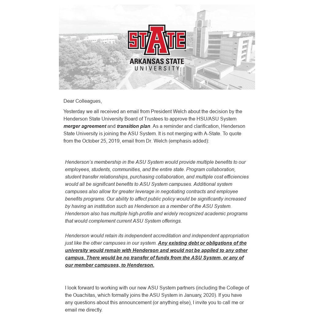 Henderson would retain its independent accreditation and independent appropriation just like the other campuses in our system. Any existing debt or obligations of the university would remain with Henderson and would not be applied to any other campus. There would be no transfer of funds from the ASU System, or any of our member campuses, to Henderson.