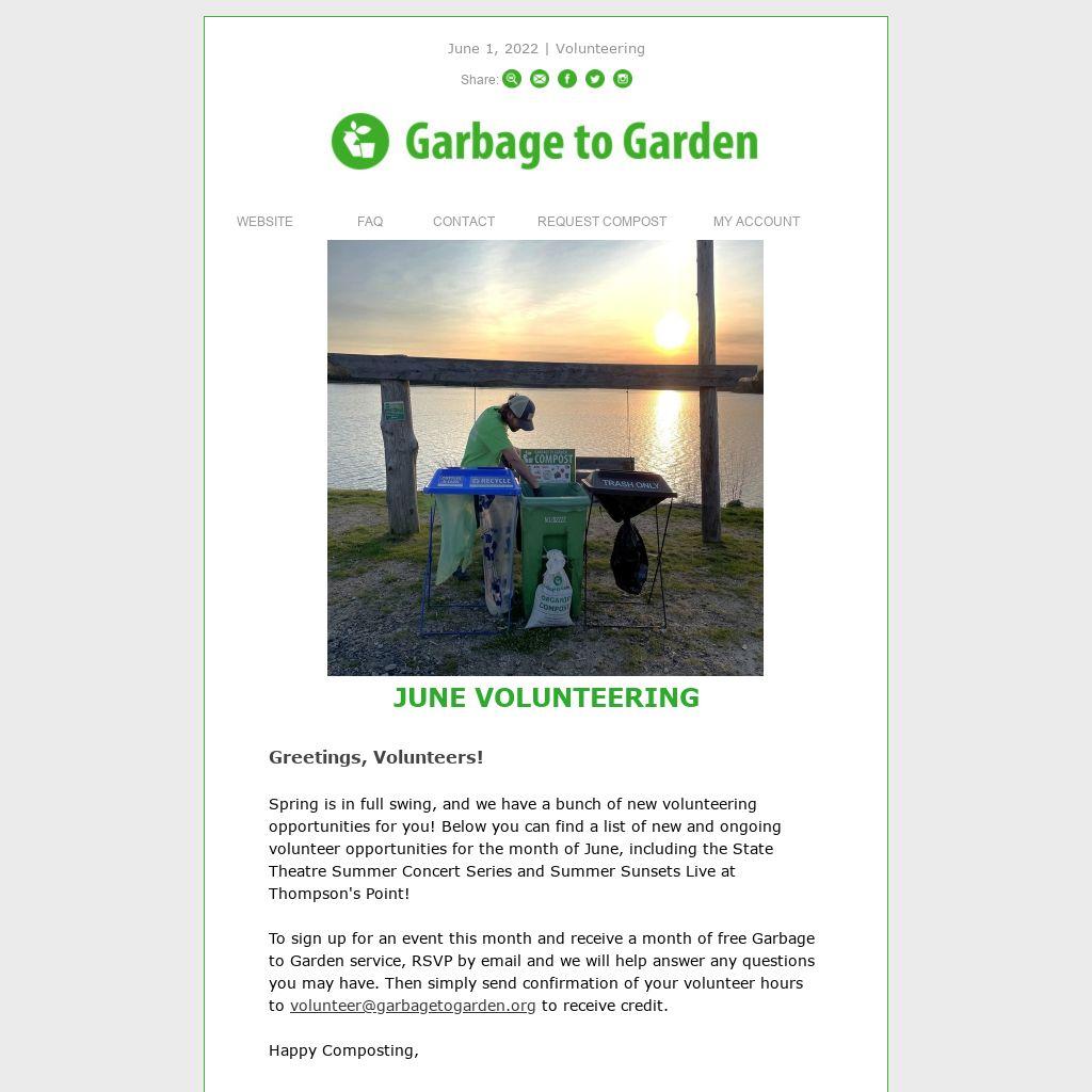To sign up for an event this month and receive a month of free Garbage to Garden service, RSVP by email and we will help answer any questions you may have. Then simply send confirmation of your volunteer hours to volunteer@garbagetogarden.org to receive credit.