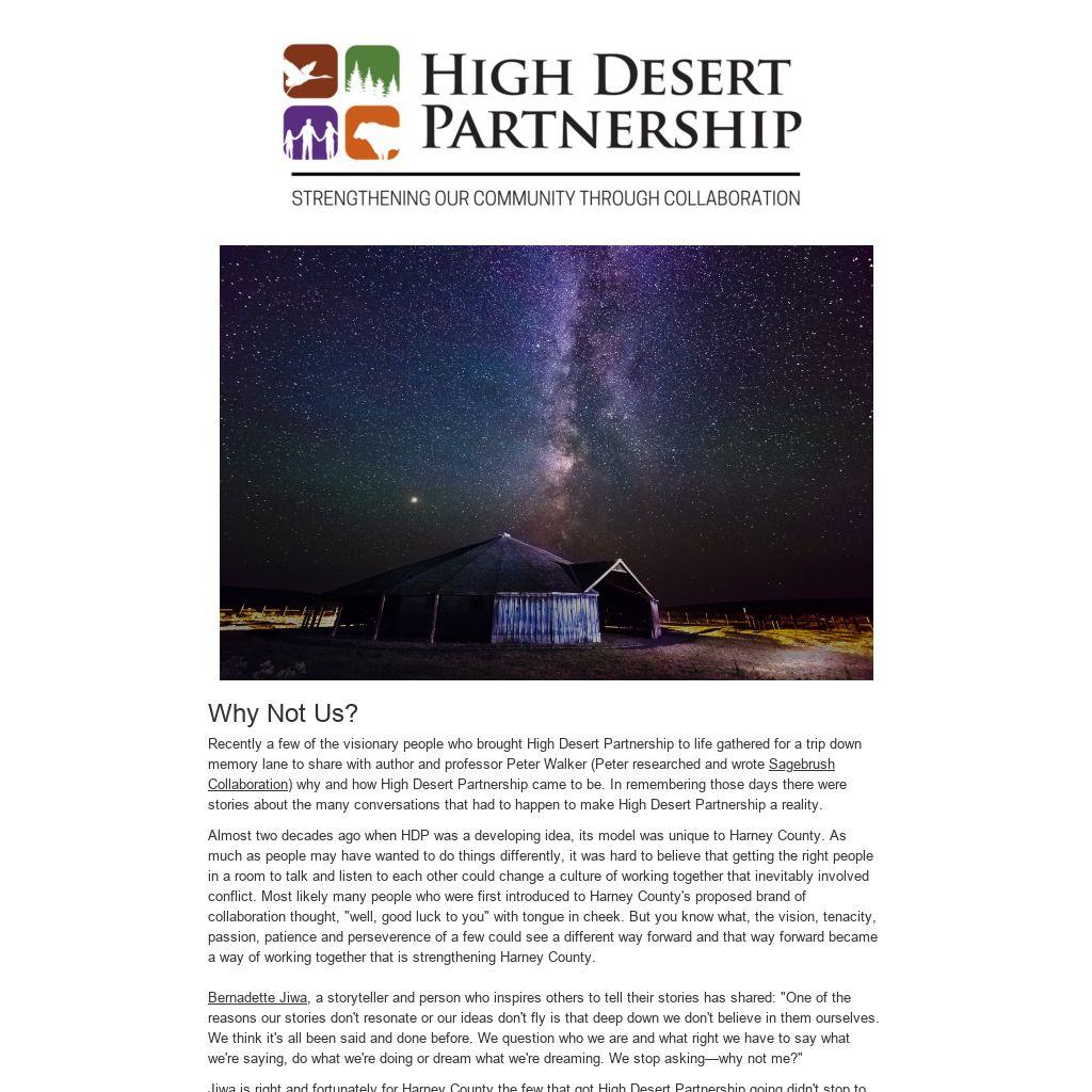 Sagebrush Collaboration) why and how High Desert Partnership came to be. In remembering those days there were stories about the many conversations that had to happen to make High Desert Partnership a reality.