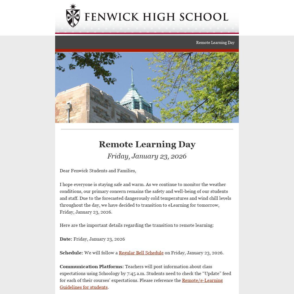 I hope everyone is staying safe and warm. As we continue to monitor the weather conditions, our primary concern remains the safety and well-being of our students and staff. Due to the forecasted dangerously cold temperatures and wind chill levels throughout the day, we have decided to transition to eLearning for tomorrow, Friday, January 23, 2026.