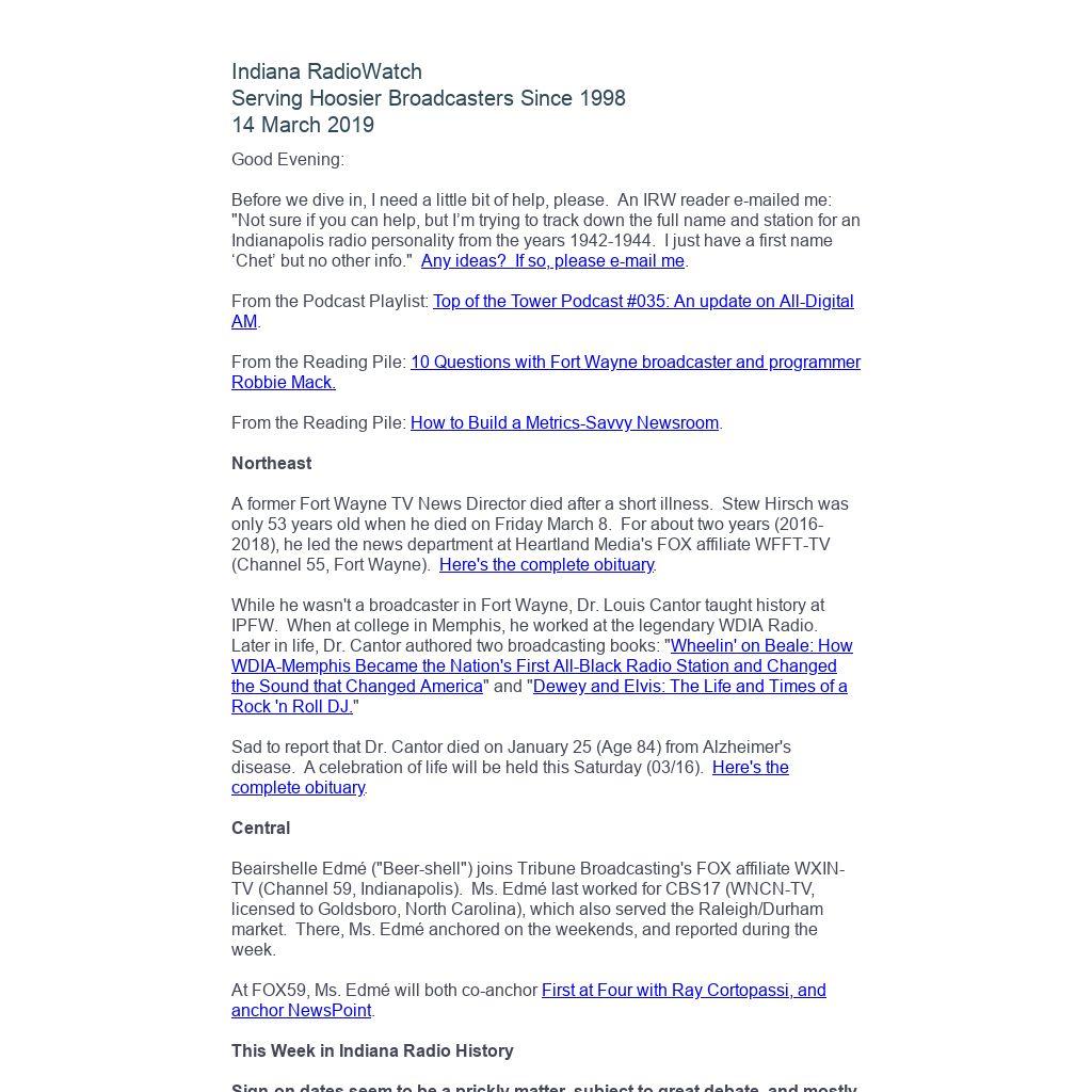 Indiana RadioWatch subscriptions are free. To subscribe, send an e-mail to irw@well.com and we'll add you. After publication, we archive Indiana RadioWatch on the Indiana Radio Archive at http://www.indianaradio.net. Please e-mail us your news stories and employment opportunities.