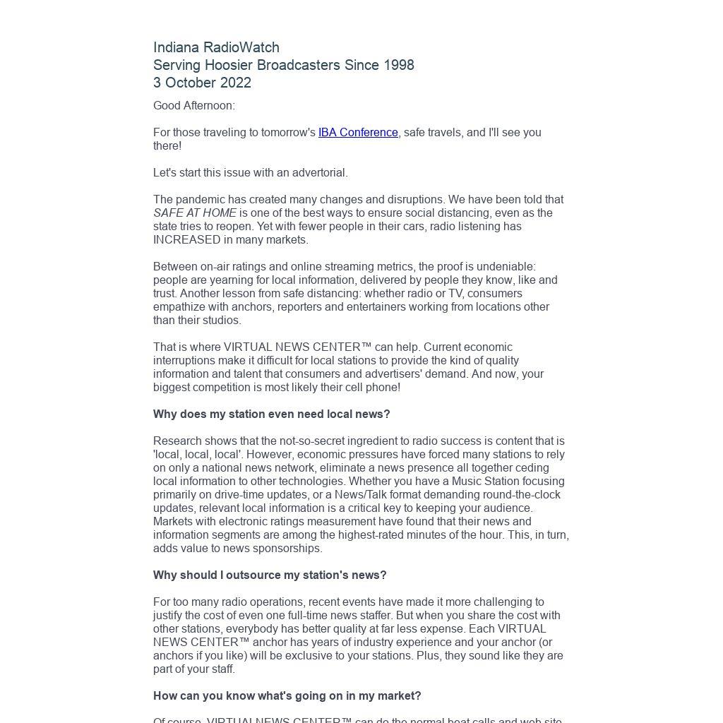 Indiana RadioWatch subscriptions are free. To subscribe, send an e-mail to irw@well.com and we'll add you. After publication, we archive Indiana RadioWatch on the Indiana Radio Archive at indianaradio.net. Please e-mail us your news stories and employment opportunities.