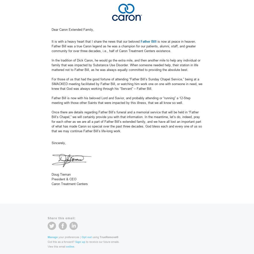 It is with a heavy heart that I share the news that our beloved Father Bill is now at peace in heaven. Father Bill was a true Caron legend as he was a champion for our patients, alumni, staff, and greater community for over three decades, i.e., half of Caron Treatment Centers existence.