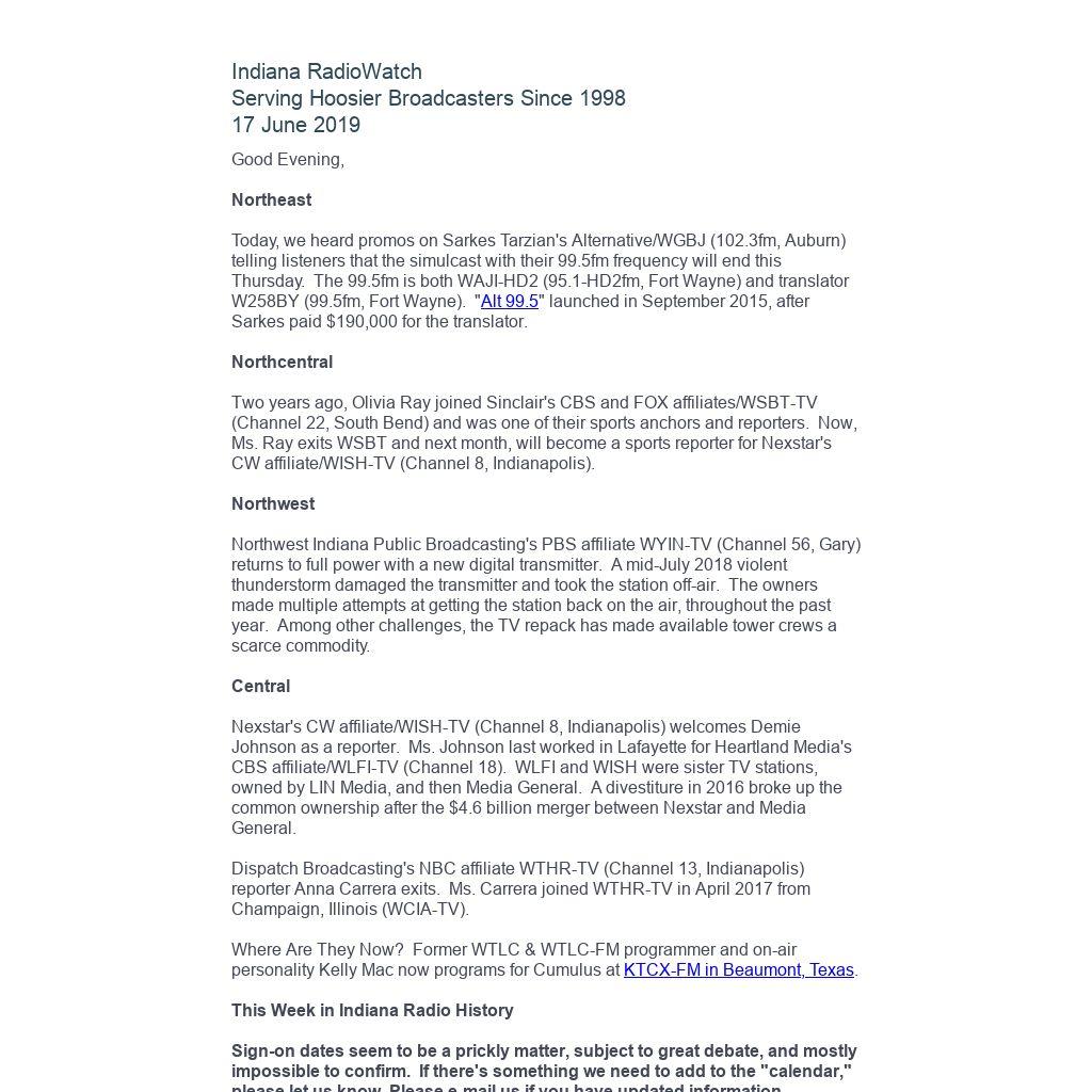 Indiana RadioWatch subscriptions are free. To subscribe, send an e-mail to irw@well.com and we'll add you. After publication, we archive Indiana RadioWatch on the Indiana Radio Archive at http://www.indianaradio.net. Please e-mail us your news stories and employment opportunities.