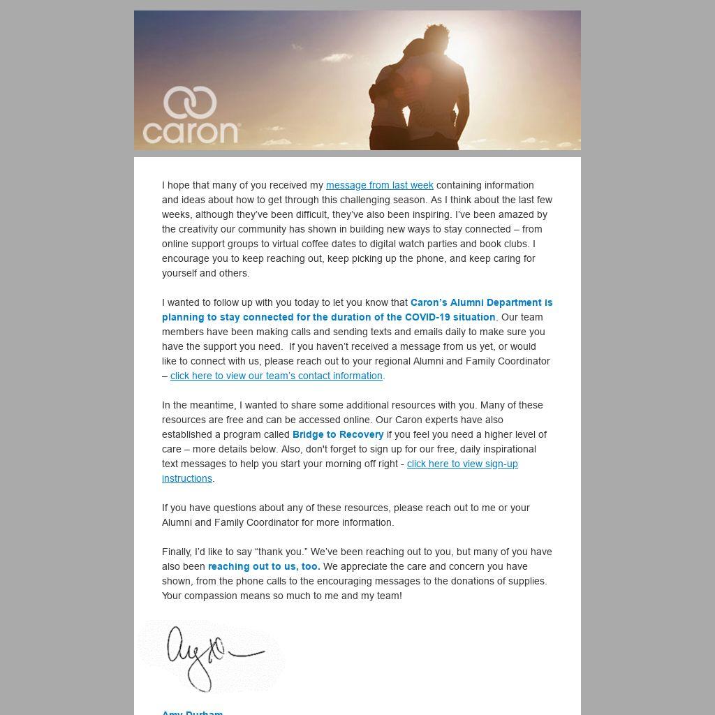 I wanted to follow up with you today to let you know that Caron’s Alumni Department is planning to stay connected for the duration of the COVID-19 situation. Our team members have been making calls and sending texts and emails daily to make sure you have the support you need. If you haven’t received a message from us yet, or would like to connect with us, please reach out to your regional Alumni and Family Coordinator – click here to view our team’s contact information.