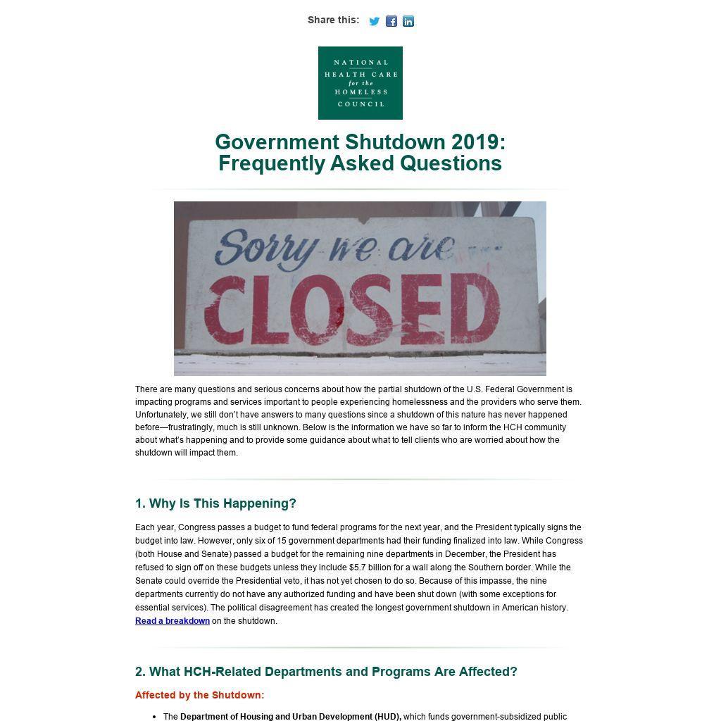 There are many questions and serious concerns about how the partial shutdown of the U.S. Federal Government is impacting programs and services important to people experiencing homelessness and the providers who serve them. Unfortunately, we still don’t have answers to many questions since a shutdown of this nature has never happened before—frustratingly, much is still unknown. Below is the information we have so far to inform the HCH community about what’s happening and to provide some guidance about what to tell clients who are worried about how the shutdown will impact them.