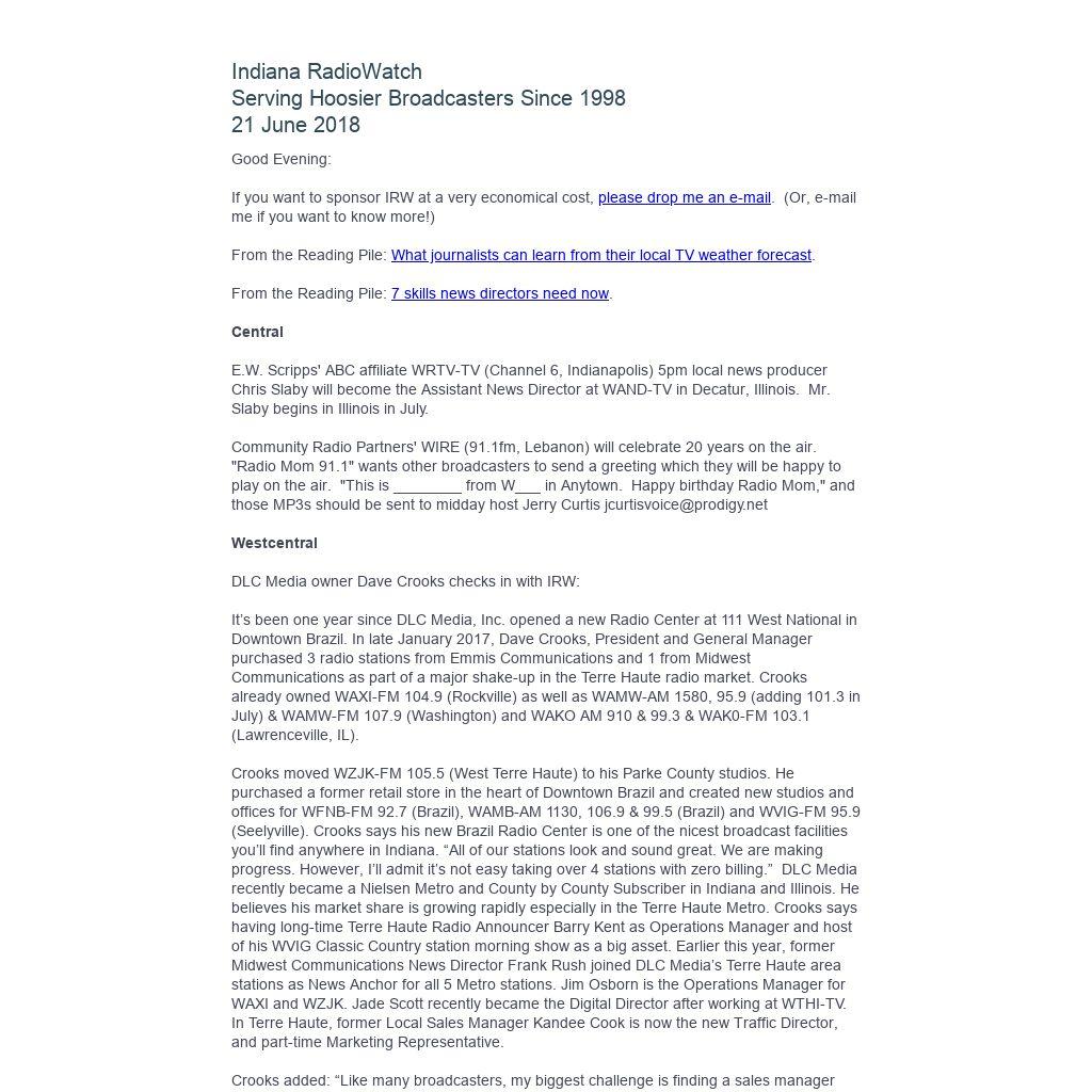 Indiana RadioWatch subscriptions are free. To subscribe, send an e-mail to irw@well.com and we'll add you. After publication, we archive Indiana RadioWatch on the Indiana Radio Archive at http://www.indianaradio.net. Please e-mail us your news stories and employment opportunities.