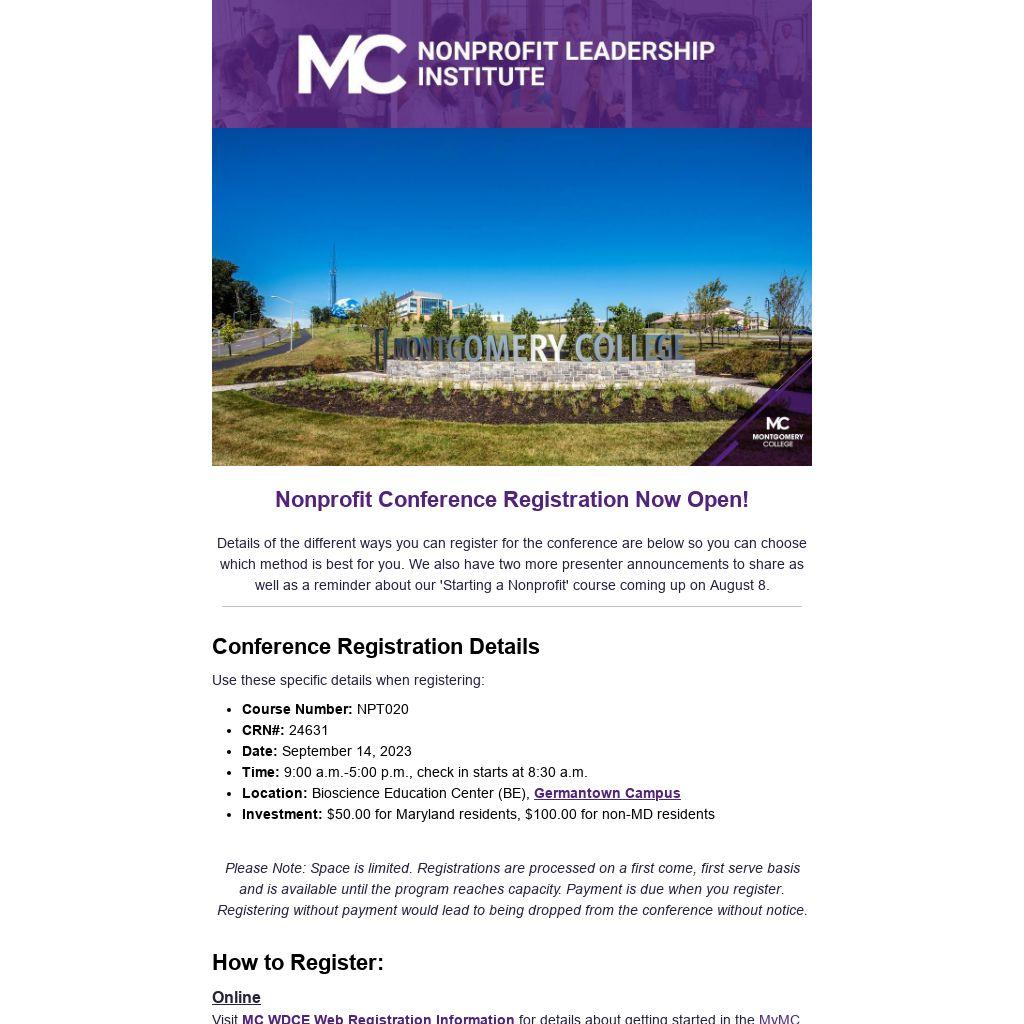 Details of the different ways you can register for the conference are below so you can choose which method is best for you. We also have two more presenter announcements to share as well as a reminder about our 'Starting a Nonprofit' course coming up on August 8.