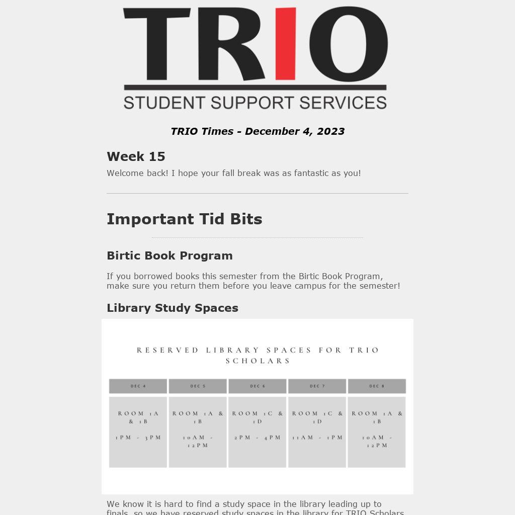 We know it is hard to find a study space in the library leading up to finals, so we have reserved study spaces in the library for TRIO Scholars leading up to finals week. See the above schedule for locations and times!