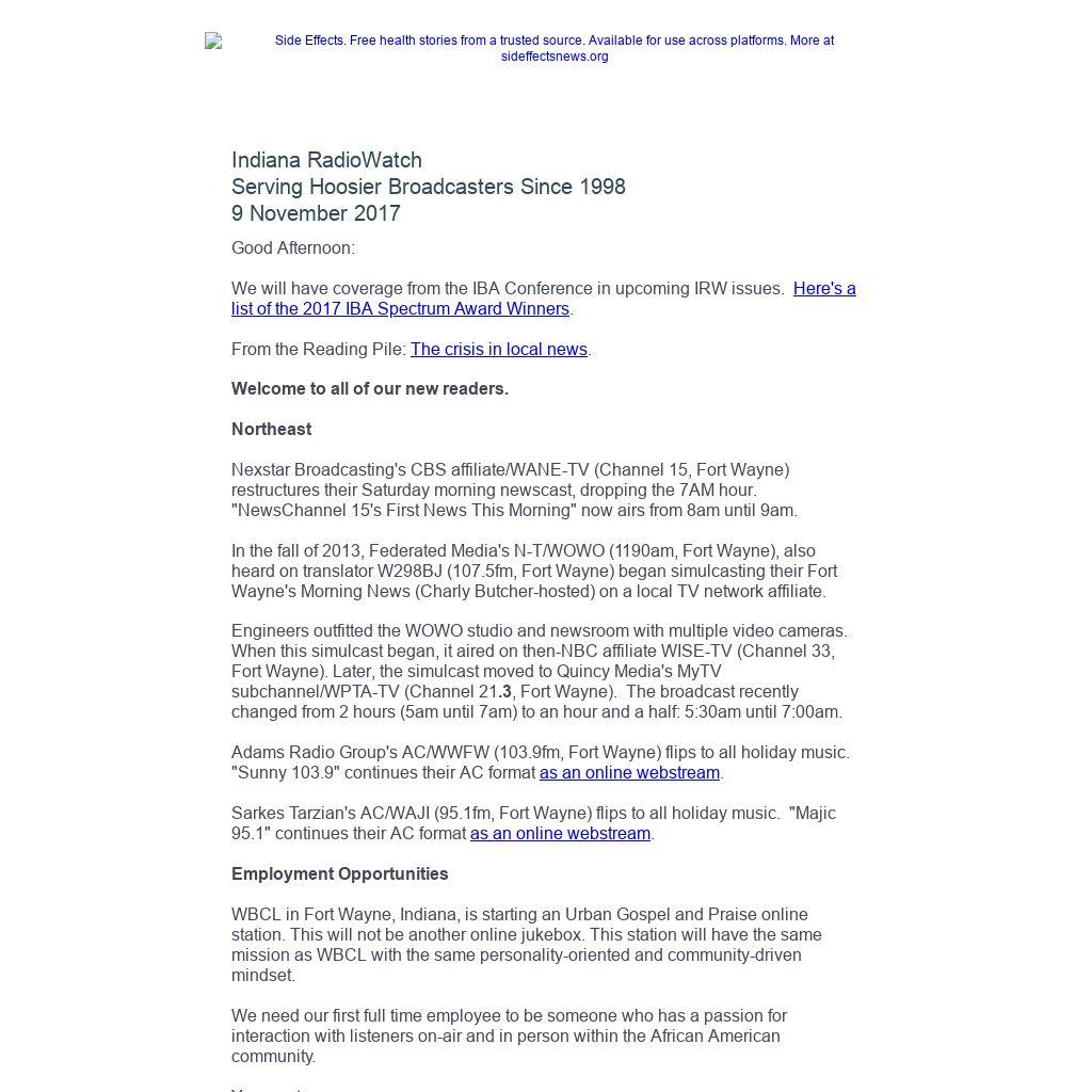 Indiana RadioWatch subscriptions are free. To subscribe, send an e-mail to irw@well.com and we'll add you. After publication, we archive Indiana RadioWatch on the Indiana Radio Archive at http://www.indianaradio.net. Please e-mail us your news stories and employment opportunities.