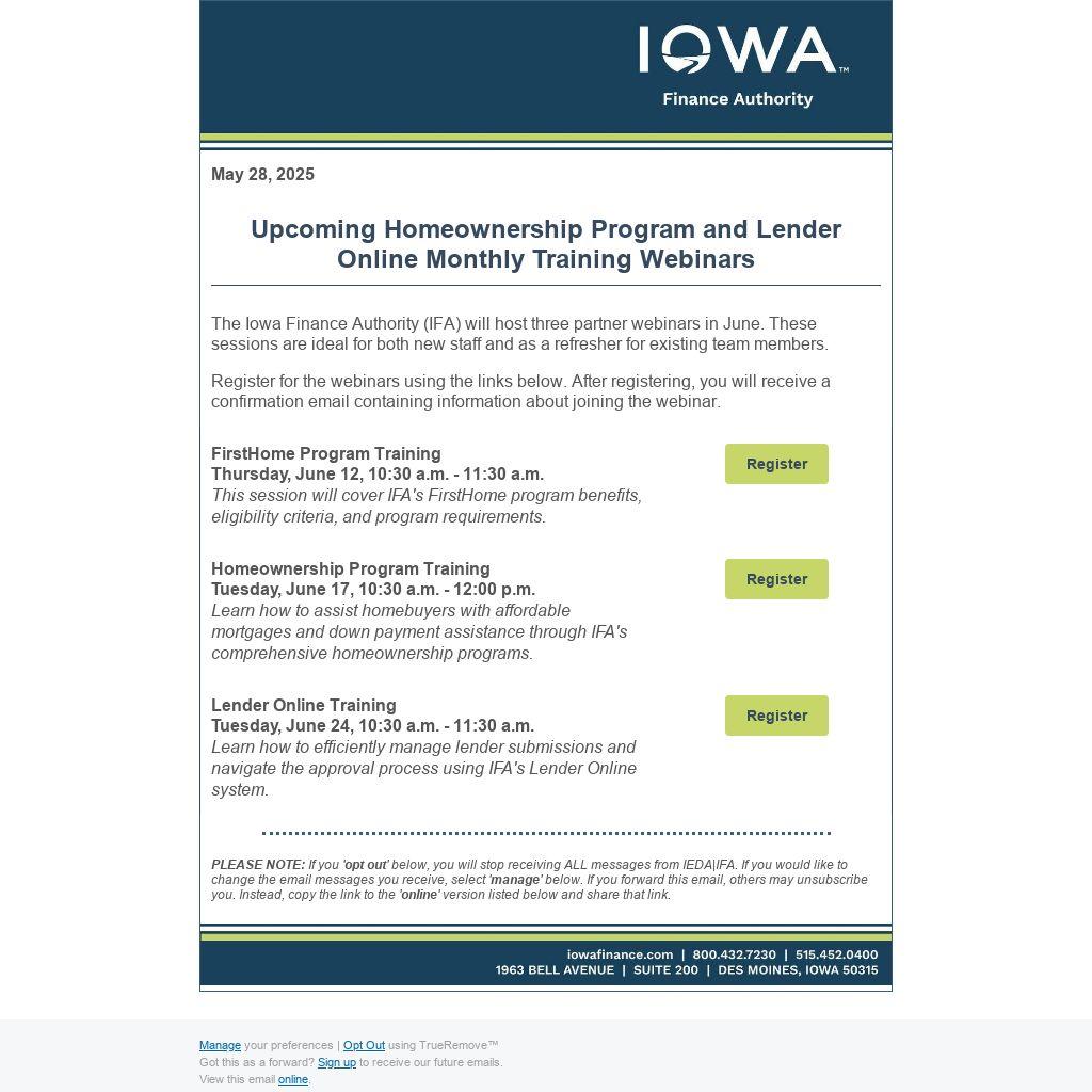 The Iowa Finance Authority (IFA) will host three partner webinars in June. These sessions are ideal for both new staff and as a refresher for existing team members.