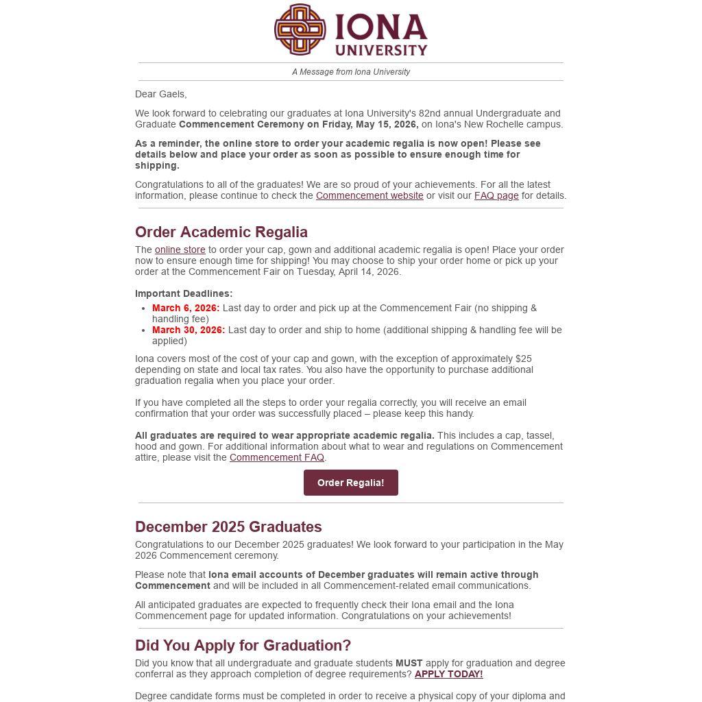 All anticipated graduates are expected to frequently check their Iona email and the Iona Commencement page for updated information. Congratulations on your achievements!