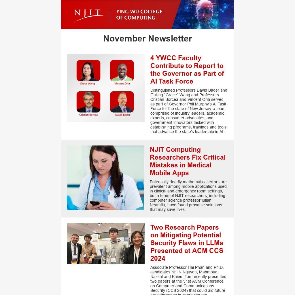 Distinguished Professors David Bader and Guiling “Grace” Wang and Professors Cristian Borcea and Vincent Oria served as part of Governor Phil Murphy’s AI Task Force for the state of New Jersey, a team comprised of industry leaders, academic experts, consumer advocates, and government innovators tasked with establishing programs, trainings and tools that advance the state’s leadership in AI.