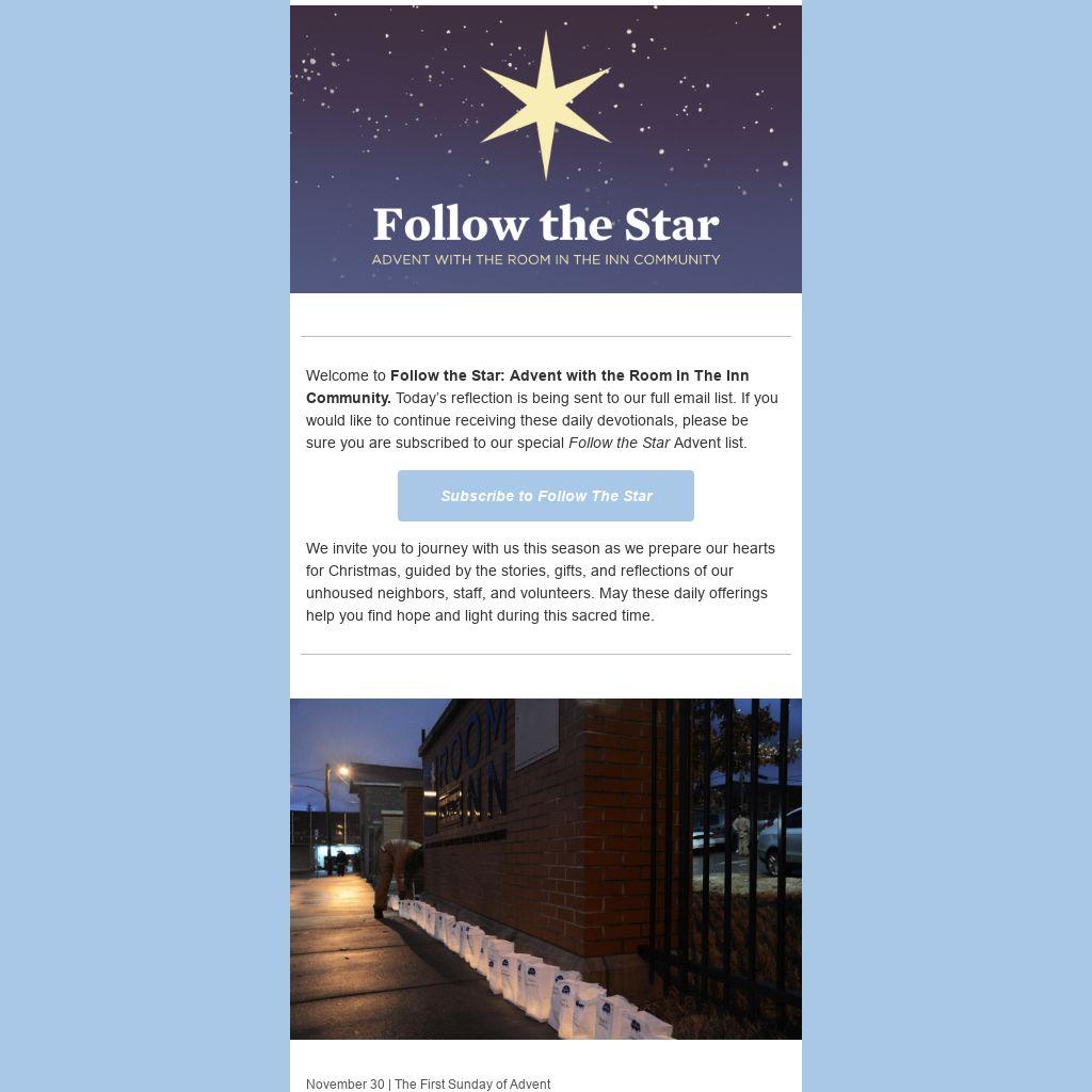 Over these next four weeks, you are invited to follow the star with us, seeking the light found in the stories and people of the Room In The Inn community. Along the way, we will encounter the strength and goodness of people who are homeless, the humility and compassion of our staff and volunteers, and the timeless wisdom of voices that have led and inspired this work through the past forty years.