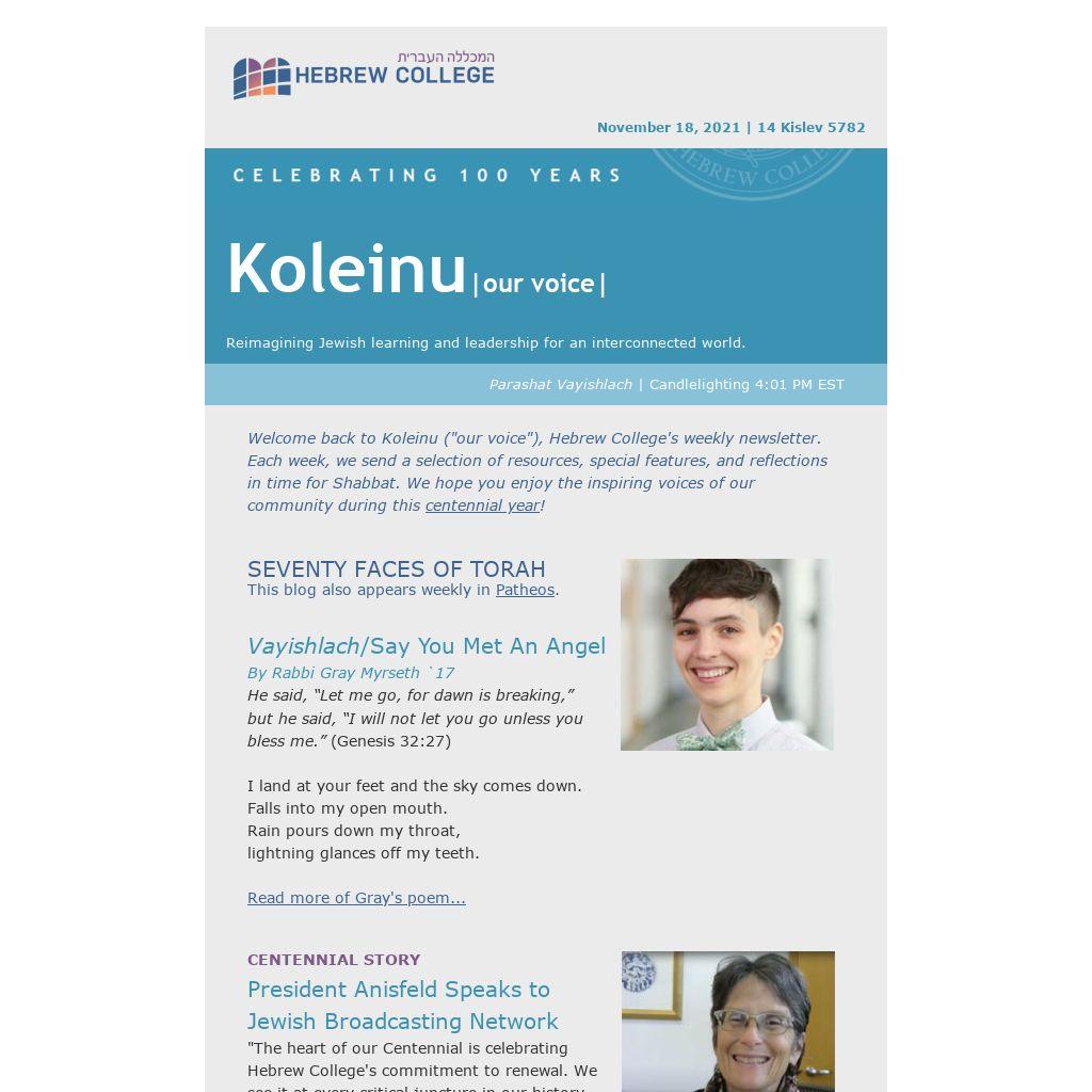 Welcome back to Koleinu ("our voice"), Hebrew College's weekly newsletter. Each week, we send a selection of resources, special features, and reflections in time for Shabbat. We hope you enjoy the inspiring voices of our community during this centennial year!
