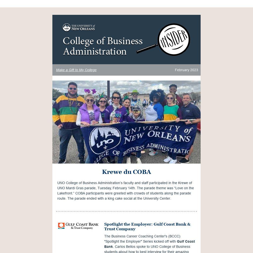 UNO College of Business Administration’s faculty and staff participated in the Krewe of UNO Mardi Gras parade, Tuesday, February 14th. The parade theme was “Love on the Lakefront.” COBA participants were greeted with crowds of students along the parade route. The parade ended with a king cake social at the University Center.
