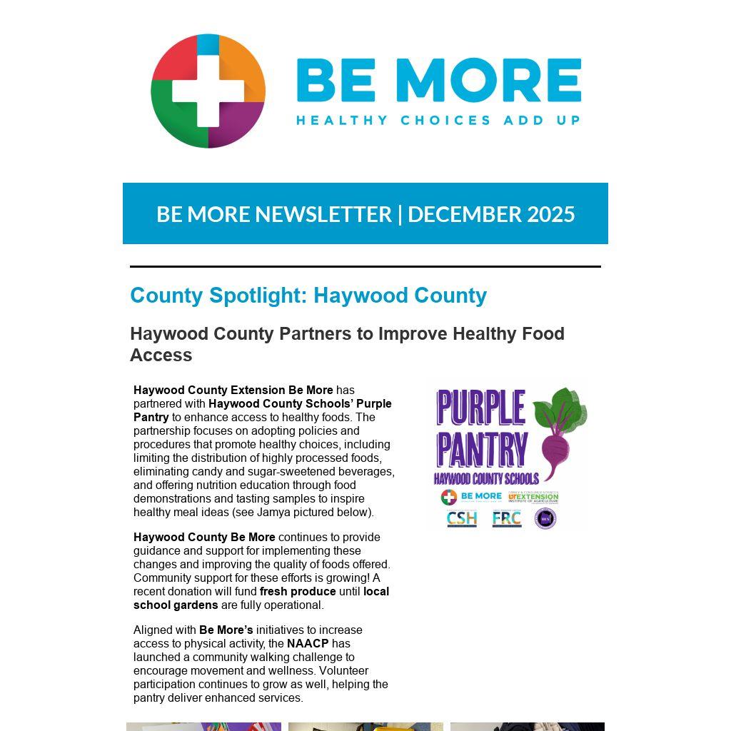 Haywood County Be More continues to provide guidance and support for implementing these changes and improving the quality of foods offered. Community support for these efforts is growing! A recent donation will fund fresh produce until local school gardens are fully operational.