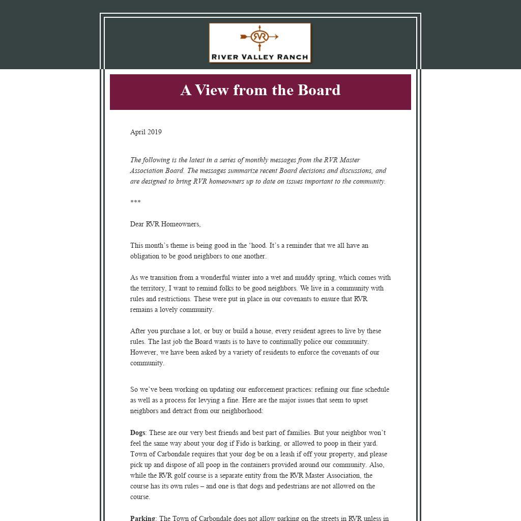 The following is the latest in a series of monthly messages from the RVR Master Association Board. The messages summarize recent Board decisions and discussions, and are designed to bring RVR homeowners up to date on issues important to the community.