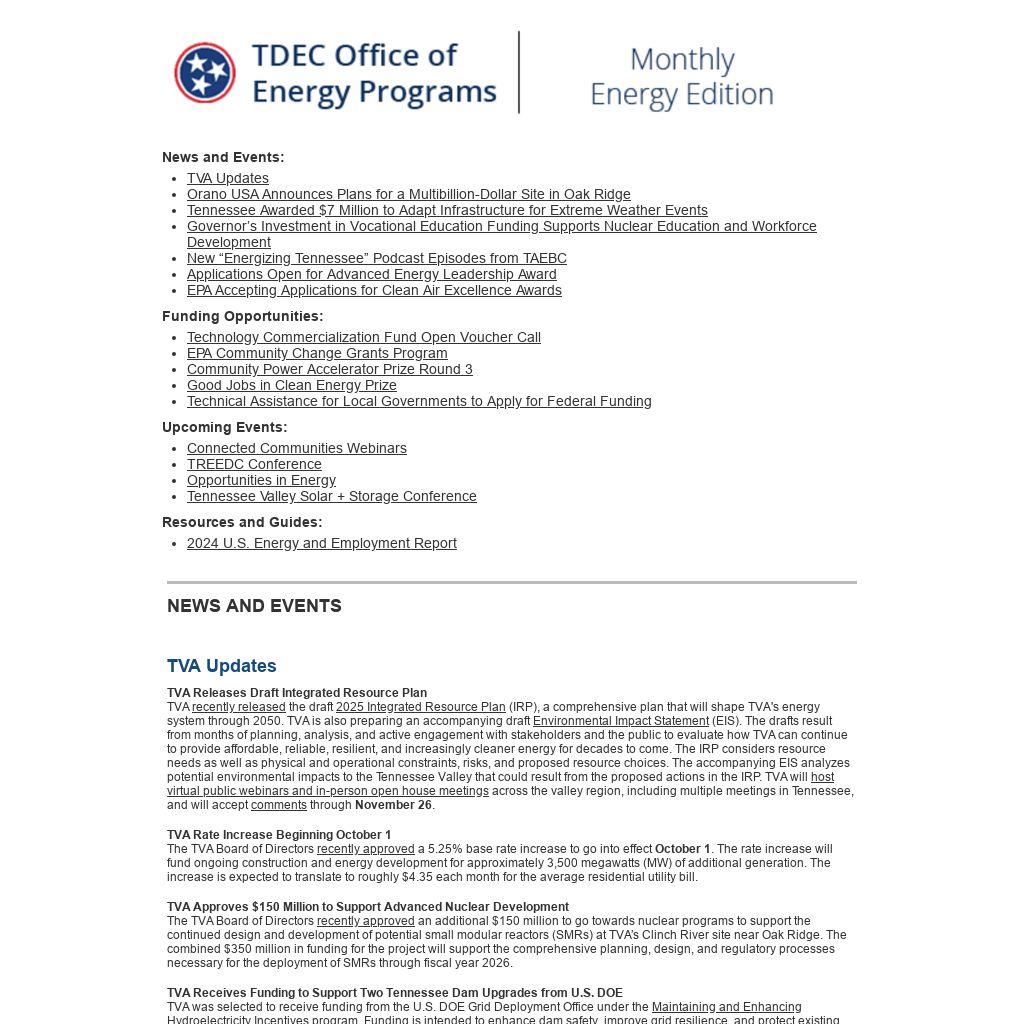 The Tennessee Renewable Energy and Economic Development Council (TREEDC) will host its annual conference in partnership with Tennessee Tech University on November 14 at the Cookeville-Putnam County Chamber of Commerce. Attendees will hear from Knox County Mayor Glenn Jacobs, sustainability professionals, energy services providers, PACE clean energy initiatives, updates from TDEC OEP, and USDA Rural Development funding opportunities. View the agenda and register for the Conference here.