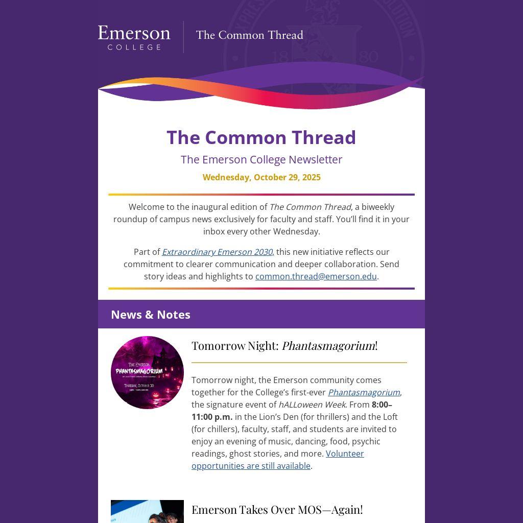 Part of Extraordinary Emerson 2030, this new initiative reflects our commitment to clearer communication and deeper collaboration. Send story ideas and highlights to common.thread@emerson.edu.