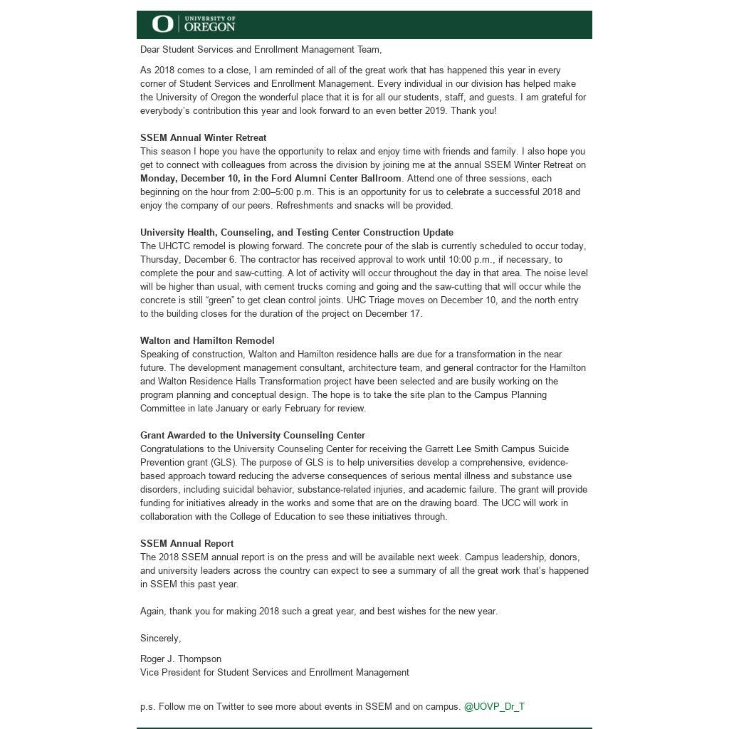 As 2018 comes to a close, I am reminded of all of the great work that has happened this year in every corner of Student Services and Enrollment Management. Every individual in our division has helped make the University of Oregon the wonderful place that it is for all our students, staff, and guests. I am grateful for everybody’s contribution this year and look forward to an even better 2019. Thank you!
